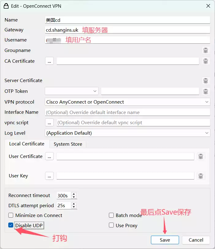 Name填美国cd,Gateway填服务器地址cd.shangins.uk(福建地区用户填sh.shangins.uk:444),Username填写用户名,勾选Disabled UDP(win7/8旧版电脑无需勾选此项),点击Save保存。