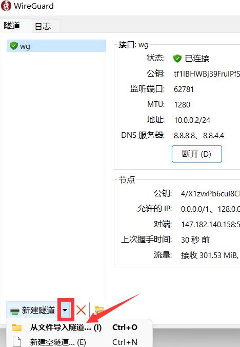 下载安装好WireGuard后打开,点击界面左下方“新建隧道”(Add Tunnel)旁边的下拉箭头,点击“从文件导入隧道”(Import tunnel from file)选择接收到的配置文件xxx.conf(向客服索要)。然后点击连接。连接上后即可使用。
